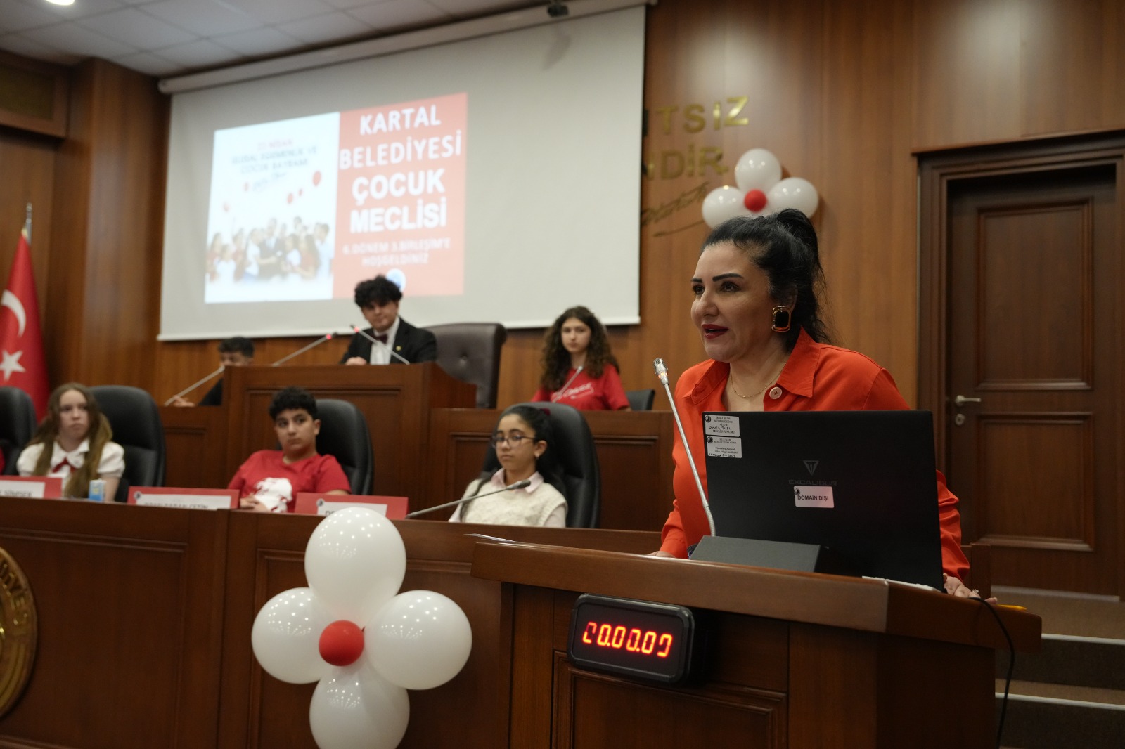 Türk bayrakları ve balonlarla süslenen salonda düzenlenen oturuma, Kartal’ın 20 mahallesinden gelen çocuk temsilciler katıldı. Programda, Kartal Belediye Meclisi 2. Başkan Vekili Olcay Özgön ve Kartal Belediyesi Başkan Yardımcısı Dr. Dilek Kars da yer aldı. Meclis Başkanı Toprak Onur Davulcu ile kâtip üyeler Zümre Şefi ve Doruk Söğüt’ün yönetiminde gerçekleşen oturum, son dönemde hayatını kaybeden çocuklar anısına saygı duruşu ve İstiklal Marşı’nın okunmasıyla başladı.