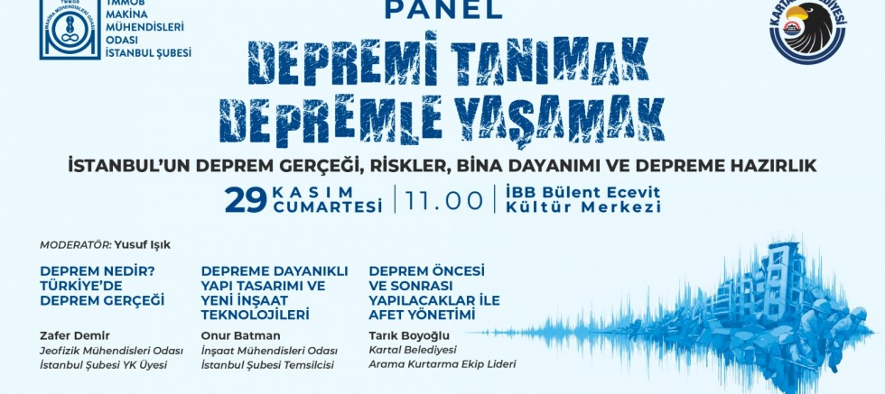 Kartal Belediyesi, Makina Mühendisleri Odası İstanbul Şubesi iş birliğiyle deprem farkındalığını artırmak amacıyla “Depremi Tanımak, Depremle Yaşamak” başlıklı bir panel düzenliyor. 29 Kasım Cumartesi günü saat 11.00’de İBB Bülent Ecevit Kültür Merkezi’nde gerçekleştirilecek etkinlikte, İstanbul’un olası depremi farklı disiplinlerin bakış açılarıyla ele alınacak.